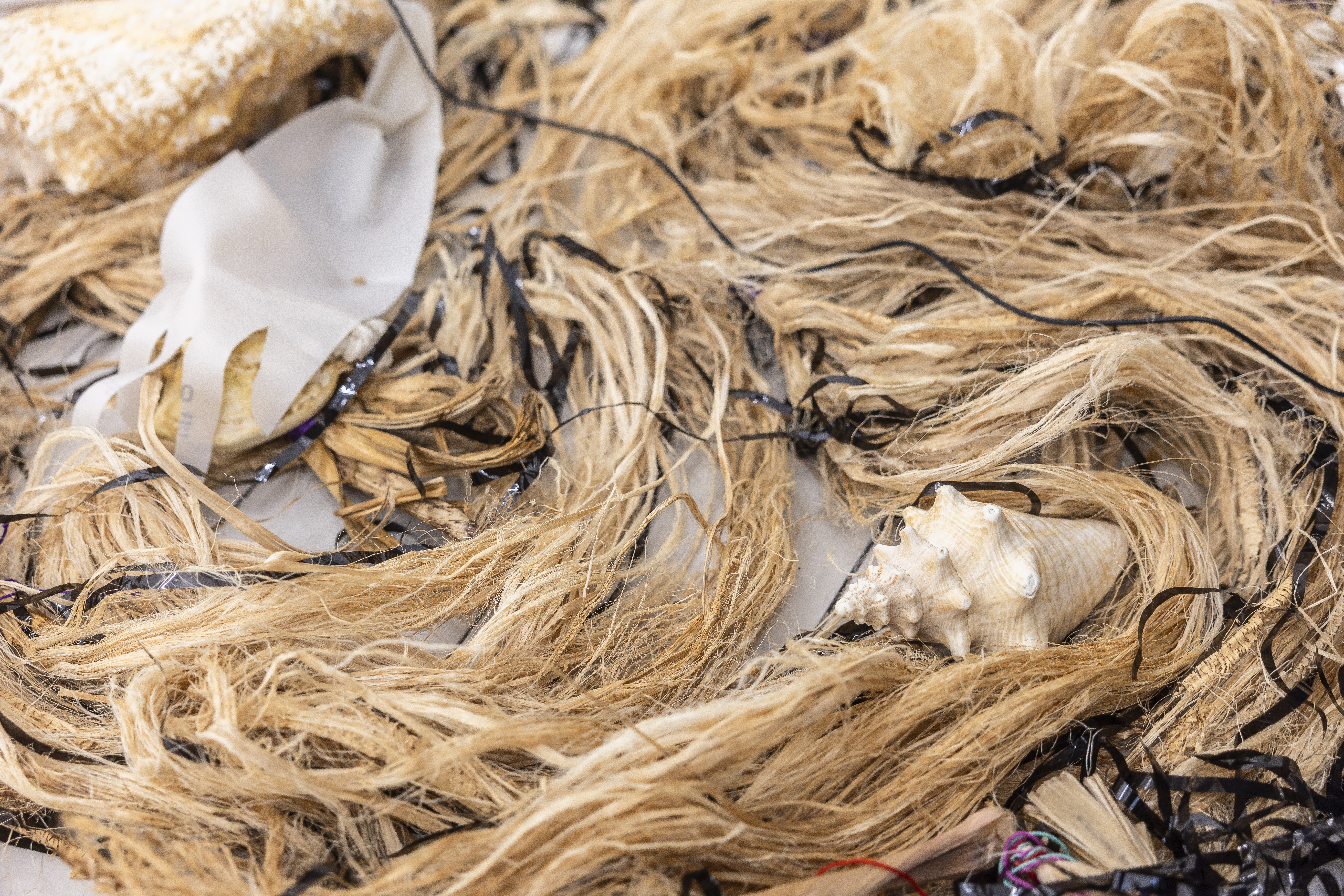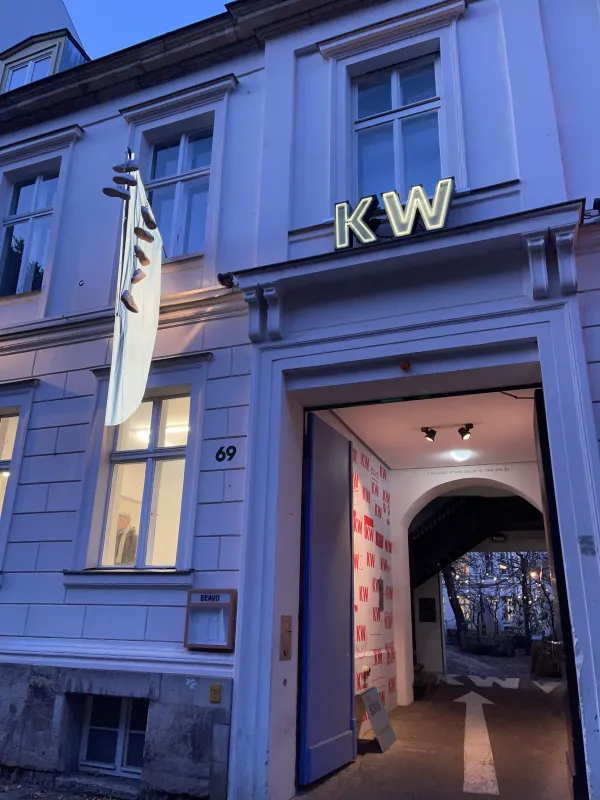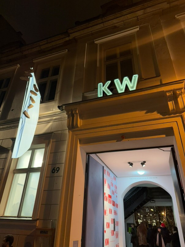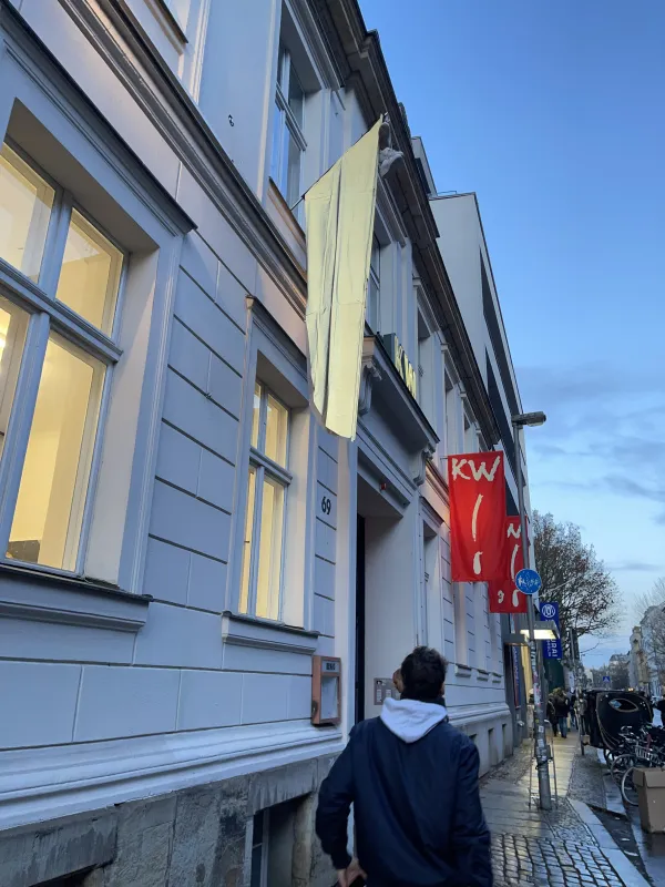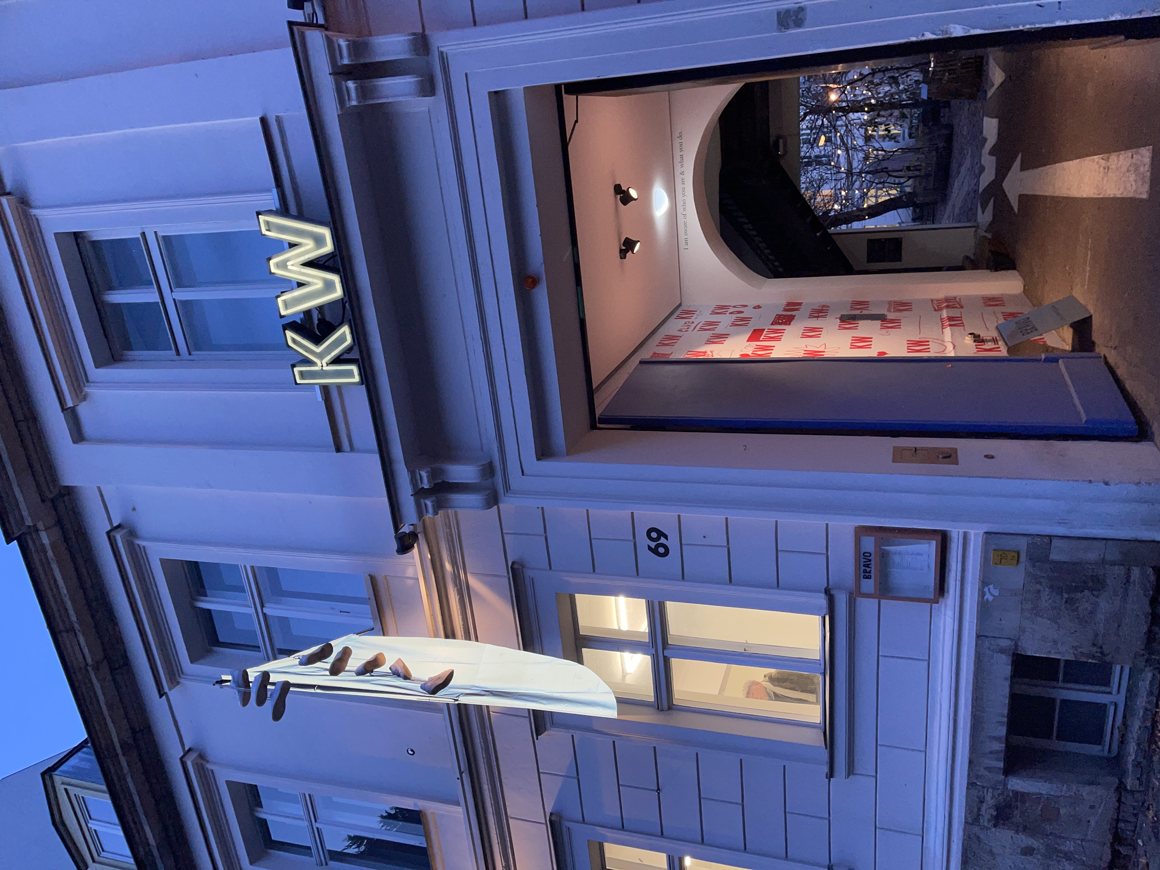 Felisha Carénage’s installation is mounted across the façades of KW’s front house and Kunst Raum Mitte, haunting–Jumbie-ing–Berlin Mitte’s buildings and streets. Marigold-dusted latex cutouts reference various cultures of mourning, the “living death” of intimate-partner terrorism, and independence in postcolonial womanhood as shaped by the death of Princess Diana – an event that for many Caribbean women signaled how freedom under empire, even in its alleged aftermath, was deadly. Strung-up sneakers mark the death of a young person and, in this work, also signal the appearance of a Moko Jumbie.