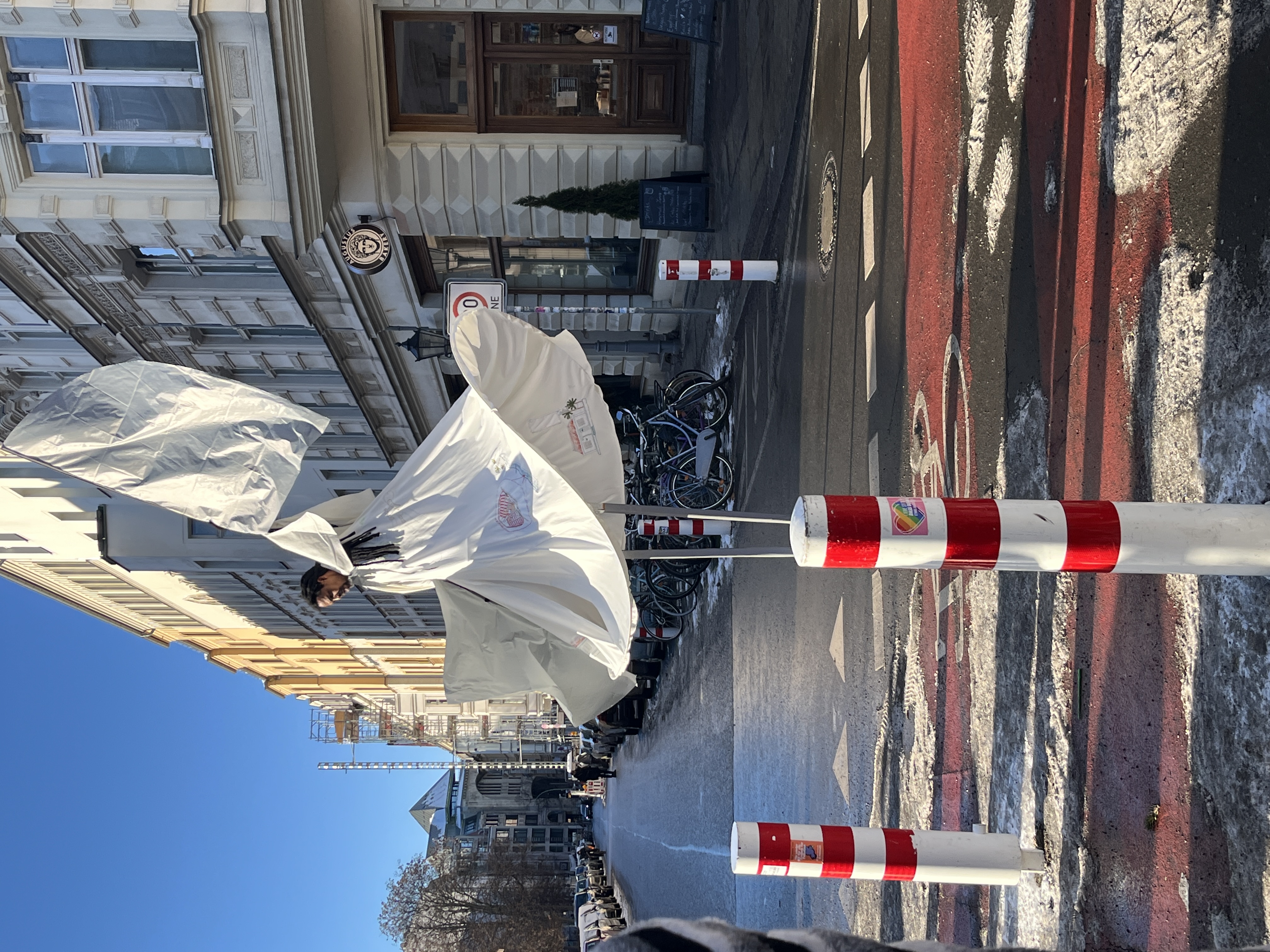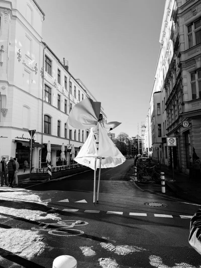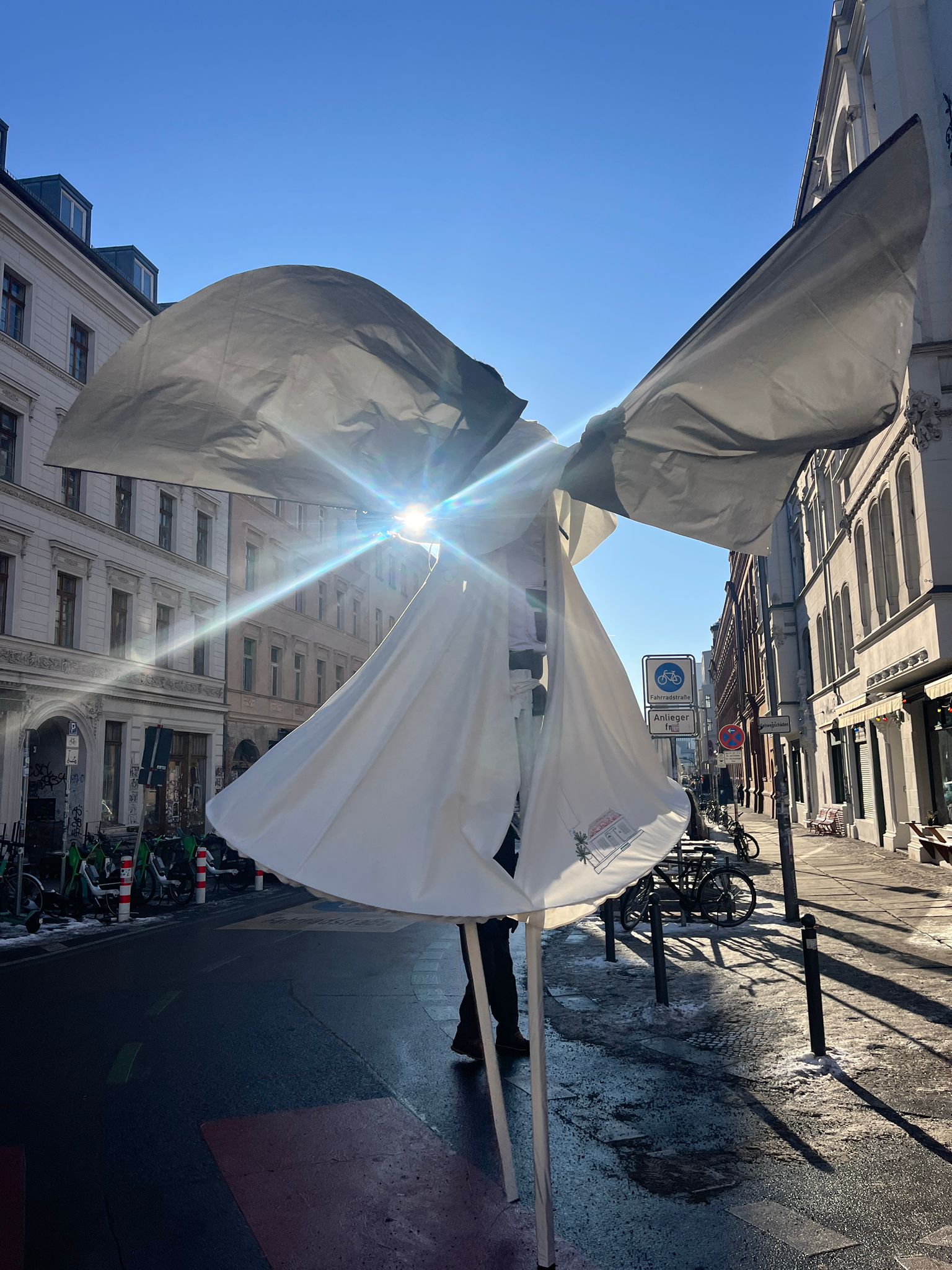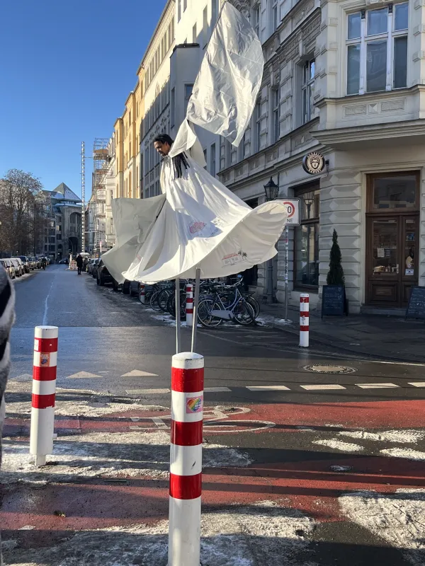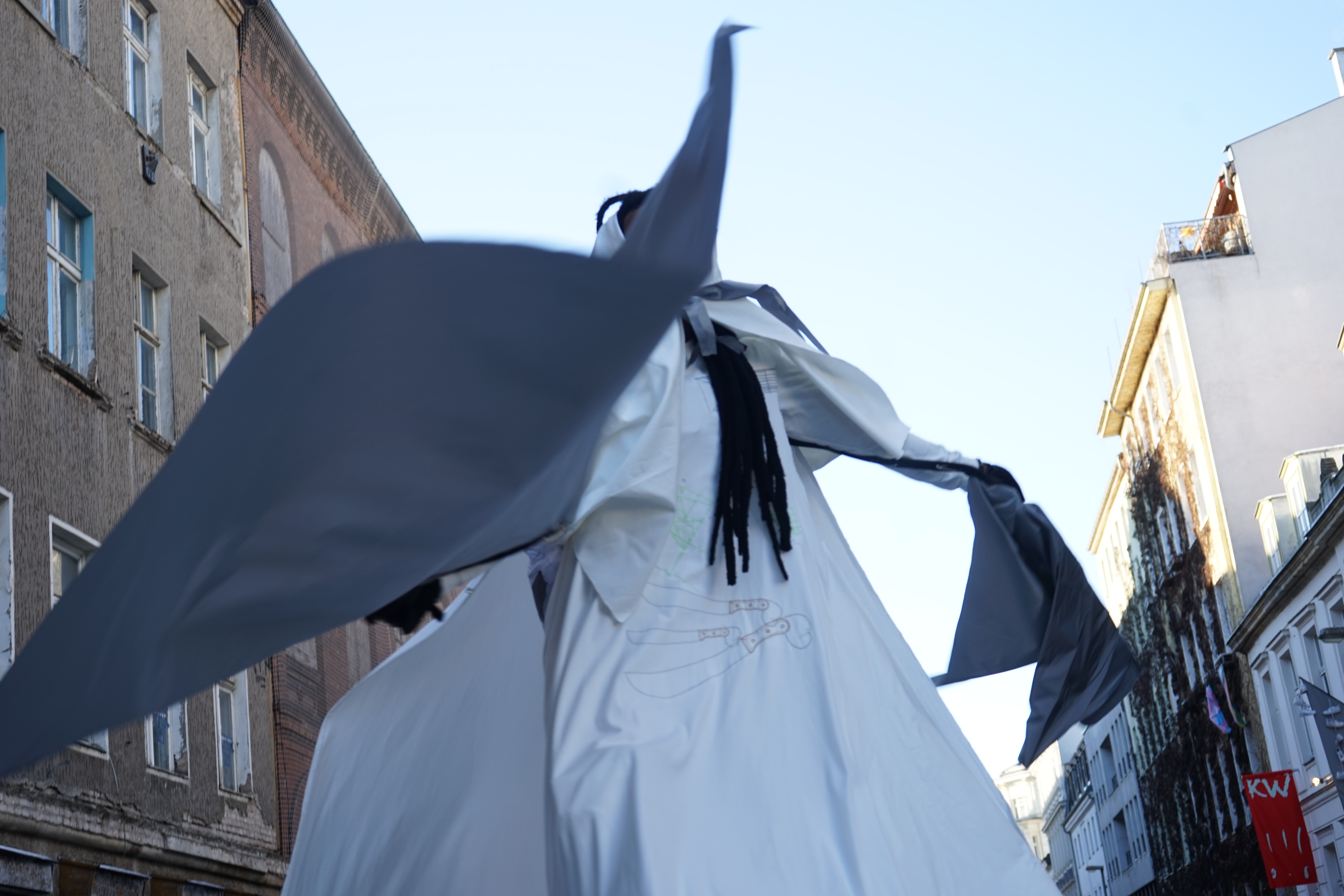 "With Yellow Bird (Choucoune), Felisha Carénage engages with the figure of the Moko Jumbie—a Caribbean stilt-walking spirit guardian with roots in West African traditions. The one-off public performance unfolds on Auguststraße, between KW’s front house and Kunst Raum Mitte, the two institutions hosting the 2025/26 BPA// exhibition, in which the artist participates. Drawing on the song Yellow Bird from the Caribbean musical repertoire, as an invocation, Carénage creates an embodied sonic interruption. Her personal and historical connections to Moko Jumbies, to Europe, and to the audience unsettle binaries tied to belonging and kinship. A presence both haunting and grounding, Carénage and the Moko Jumbie glitch Creole memory into Berlin’s public space."