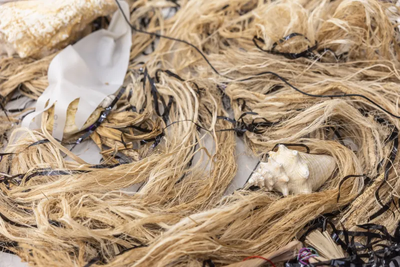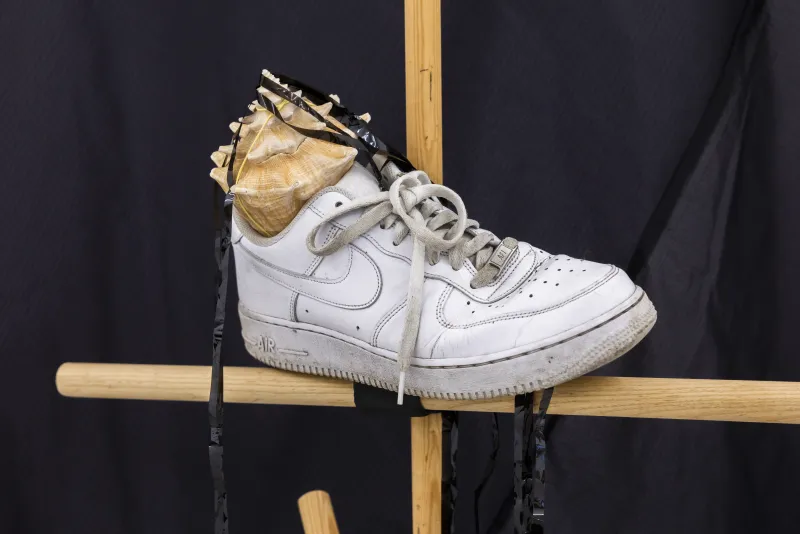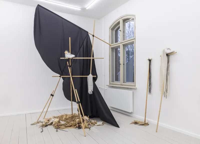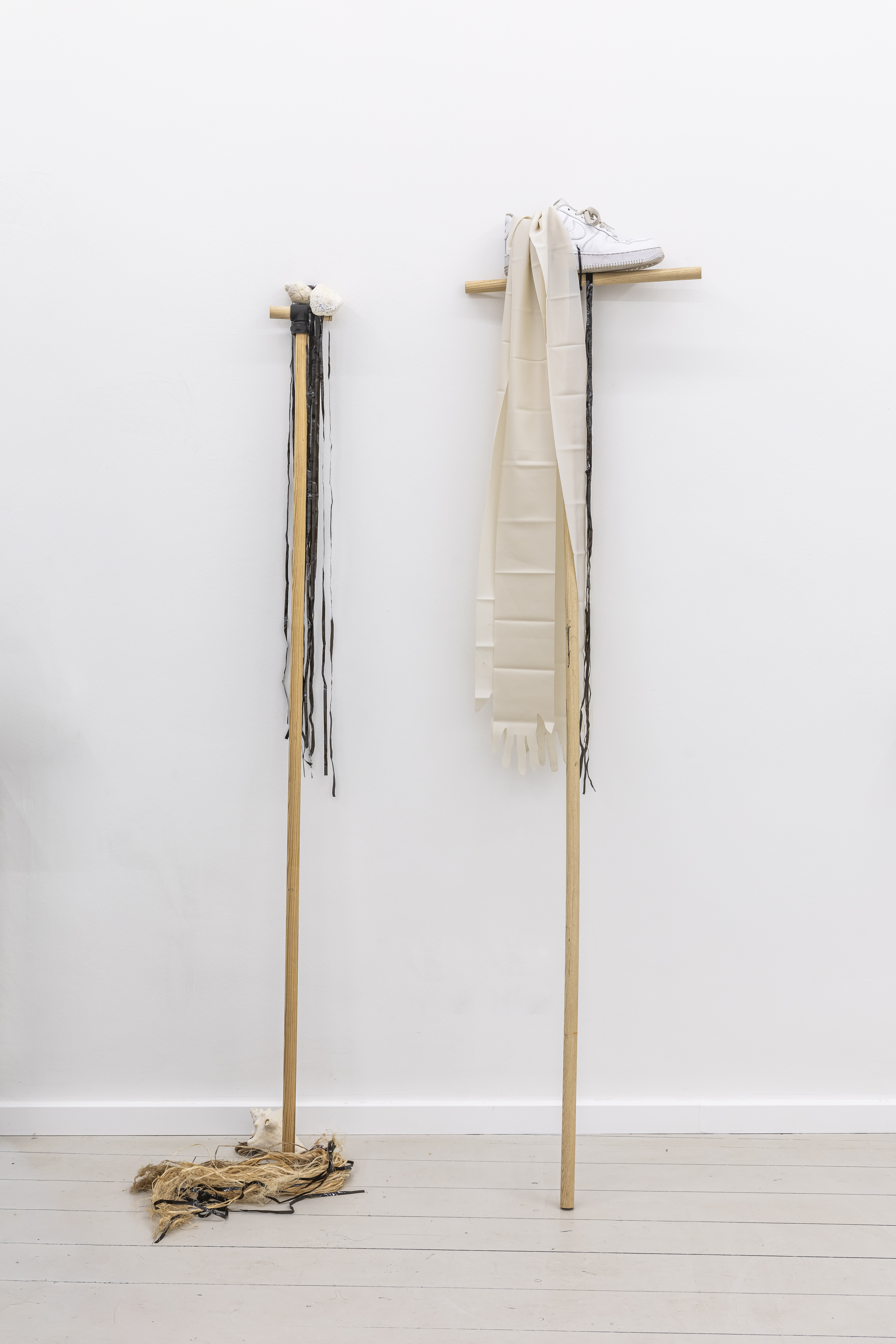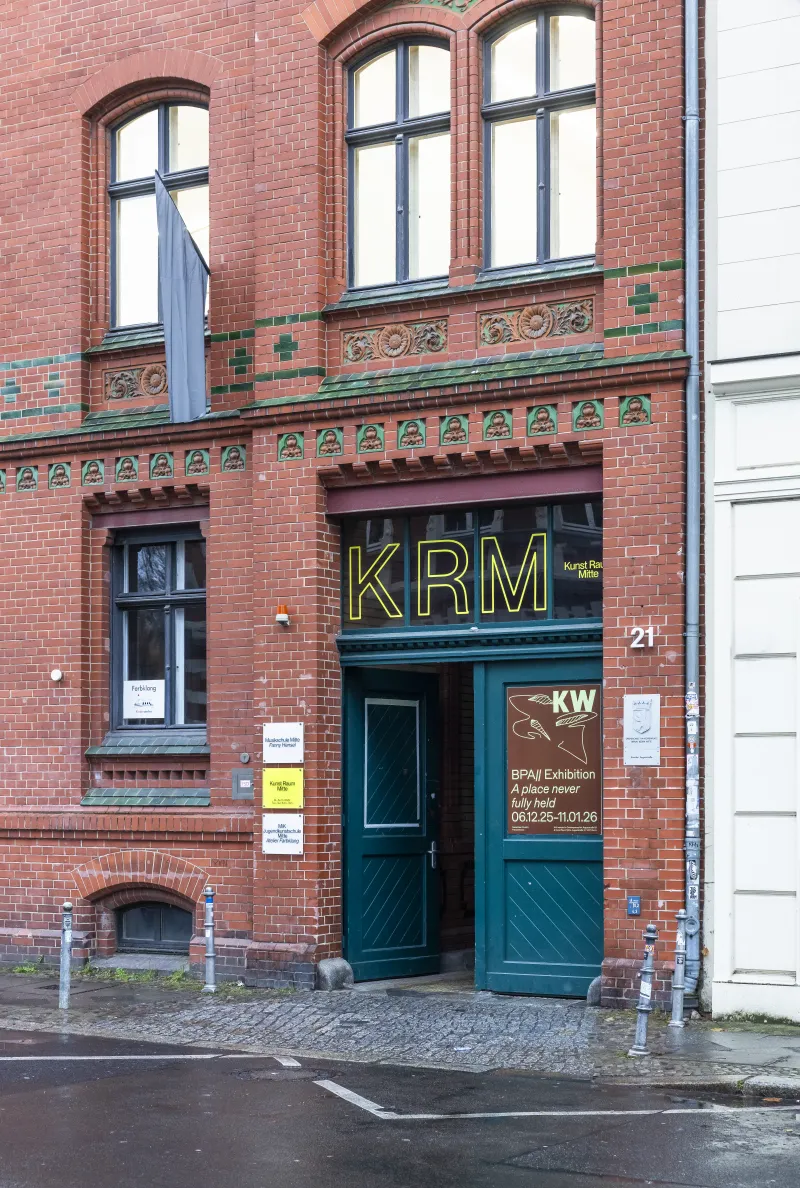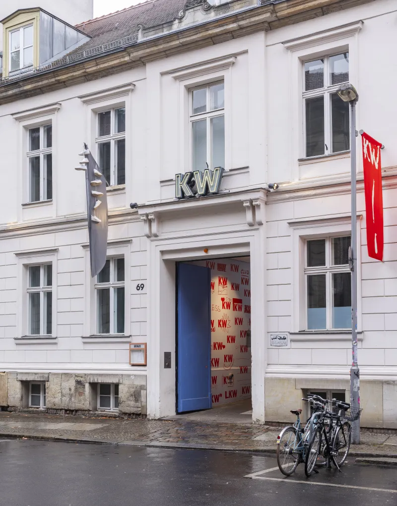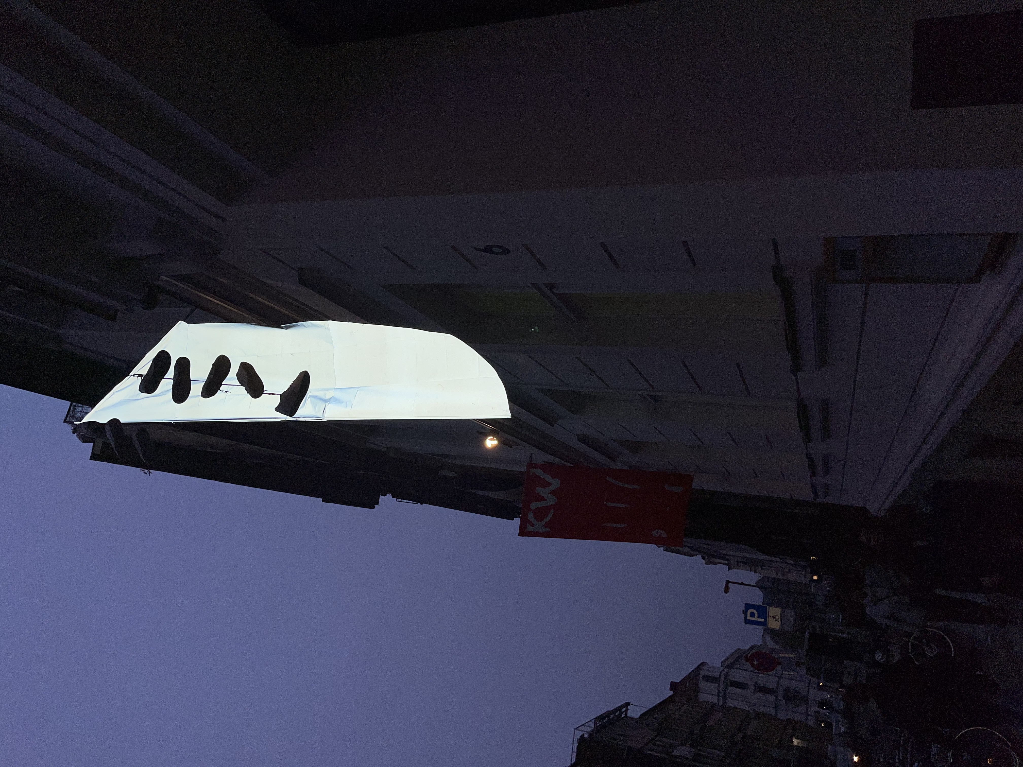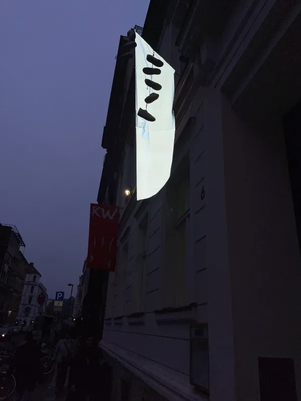 Felisha Carénage’s installation is mounted across the façades of KW’s front house and Kunst Raum Mitte, haunting–Jumbie-ing–Berlin Mitte’s buildings and streets. Marigold-dusted latex cutouts reference various cultures of mourning, the “living death” of intimate-partner terrorism, and independence in postcolonial womanhood as shaped by the death of Princess Diana – an event that for many Caribbean women signaled how freedom under empire, even in empire's alleged aftermath, was deadly. Strung-up sneakers mark the death of a young person and, in this work, also signal the appearance of a Moko Jumbie.
