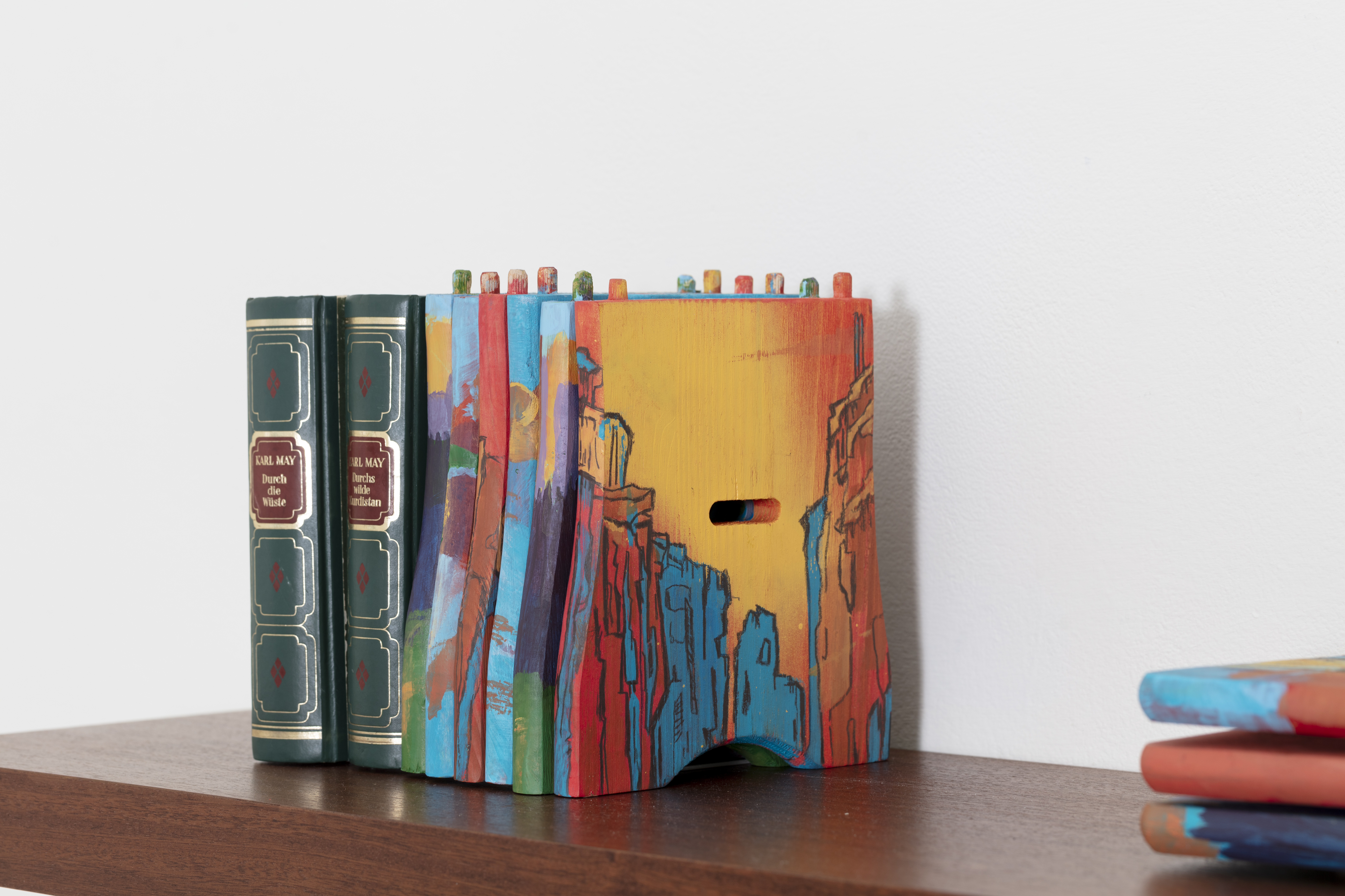 EN: The đ„Winnetou ist n Splasher!đ„ stools make painterly reference to the covers of the Karl May novels, as the romance of these landscapes is sustained by the extinction of human life. In this work, I consider my own life as one of those erased.